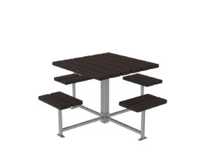 Bring people together in public parks and on campuses with the 400 Series – 400 Cluster Seating system. The frame is constructed using HS steel tube and flat bar, with table top and seats available in thermal wood, metal or HDPE recycled plastic. This traditional table and seating system can be customized to your site’s needs with wheelchair accessibility, a gaming board or an umbrella hole.