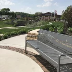 The greenway features a 1,938-foot long creek and floodplain, a multi-use trail system, a play area with slides, scenic overlooks, an urban orchard and garden, and an outdoor amphitheater which provides a venue for teaching and neighborhood gatherings. For this project, Maglin created modified 970 Series benches with custom laser-cut scenes on the bench backs and trash/recycling containers. The street furniture is located along the creek’s pathways and some also incorporate a memorial plaque.