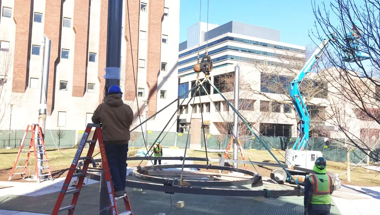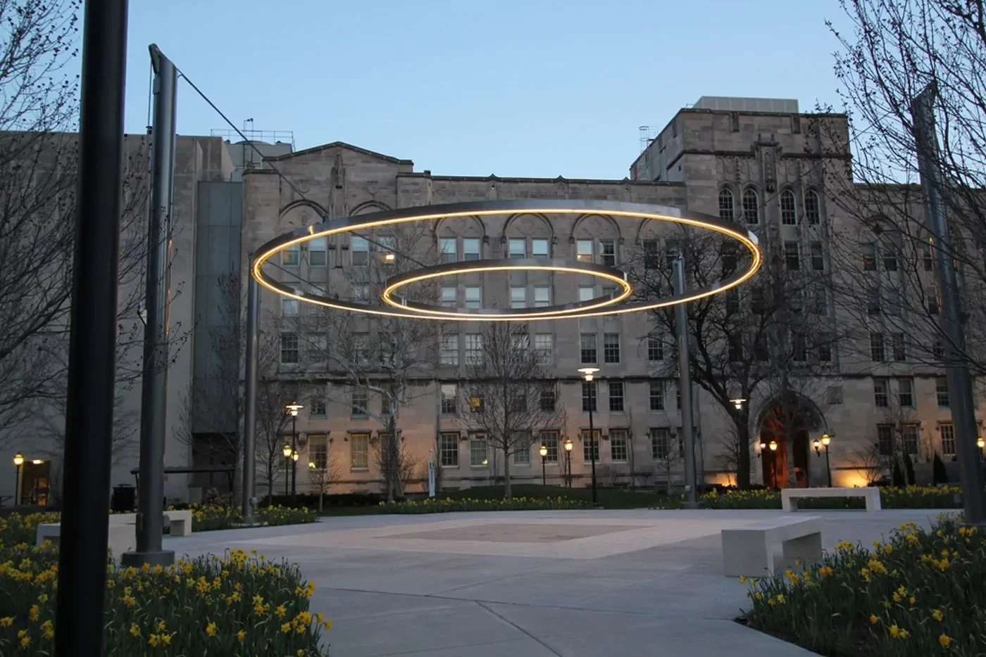 The University of Chicago, known for its architectural highlights and renowned alumni, transformed an open space in the Crerar Science Quadrangle into a bold artistic installation. Associate Director for Campus Environment Richard Bumstead, with 35 years of experience as the university’s landscape architect, envisioned two immense concentric circles of light suspended in mid-air. Designed to inspire awe and reflection, the project required custom solutions and trusted collaborators to bring the vision to life.
